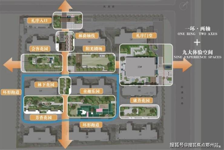 锦上和风通过 “一环两轴九大空间”布局,把 森林公园元素融入社区: