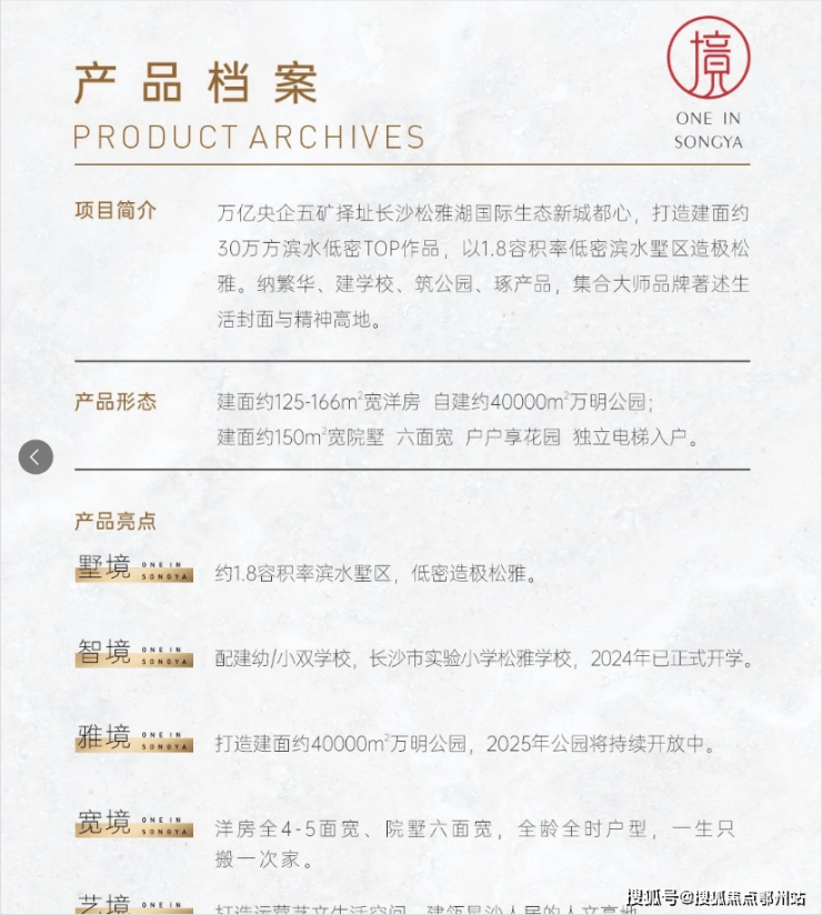 五矿 ·万境松雅 是由 万亿央企巨匠、世界500强排名第56位的中国五矿集团 打造的建面约30万方滨水低密高端作品,是 五矿“万境产品系”TOP级 先河之作。项目中间原生河道,规划为建面约4万方滨河休闲康乐公园;将项目一分为二东、西地块。西地块由 9栋高层住宅,17栋多层叠墅组成,珍罕1.8容积率低密滨水墅区,造极松雅
