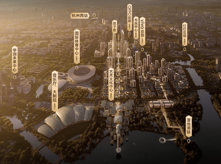 企业总部扎堆:OPPO移动终端研发总部、字节跳动华东中心(145米地标)、vivo全球AI研发中心、钉钉全球总部相继落位
