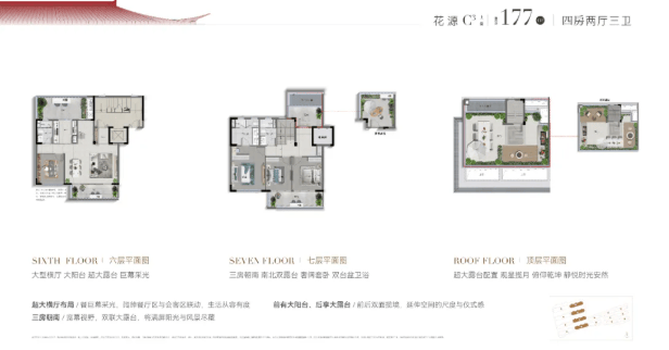 上叠(建面约156-177㎡):屋顶露台+全景窗,尽揽天际线
