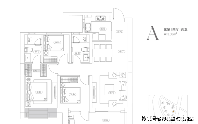 建面约130平,三房两厅两卫: