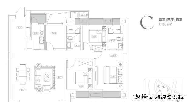建面约165平,四房两厅两卫:
