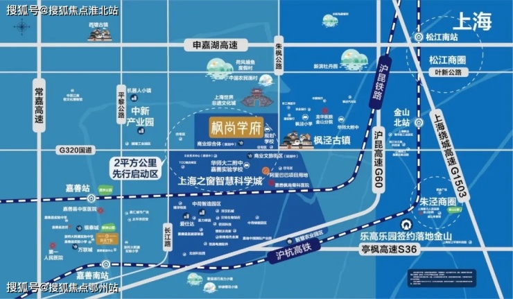 在高速方面,项目紧邻G60高速,距离枫泾出口约2KM,互通沪昆高速、亭枫高速、沪嘉杭高速、申嘉湖高速、苏嘉杭高速等高速路网,链接上海、杭州、南京、宁波等长三角核心经济城市。(以上距离均为直线距离)