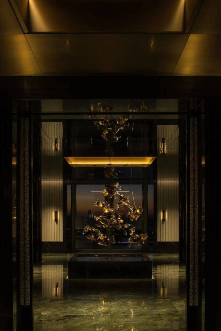 比如 红酒雪茄厅, 设计灵感来源于迪拜奢华酒店The Lana,颇有一种老上海风情;多功能区是一个 270度水景环绕的区域, 玻璃门可开可合,关上就是私密空间,打开就能亲近自然。