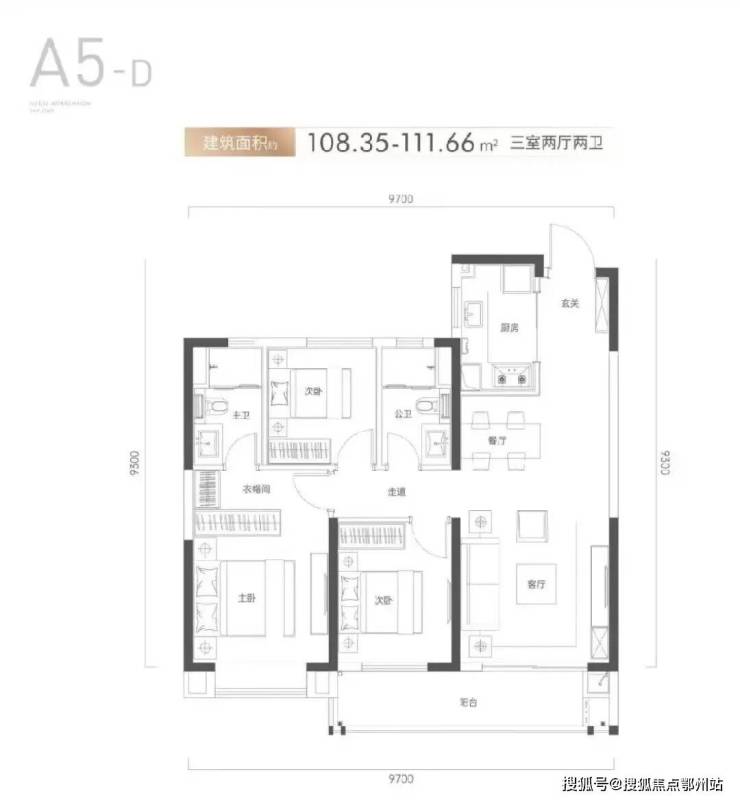 建面约108-111㎡的A5-D户型,3室2厅2卫:中间户,三开间朝南;北面对连廊,依靠连廊有一定通透性,不过北侧房通透性和私密性一般;动静分区,主卧带独立卫生间,南向大阳台连通卧室。