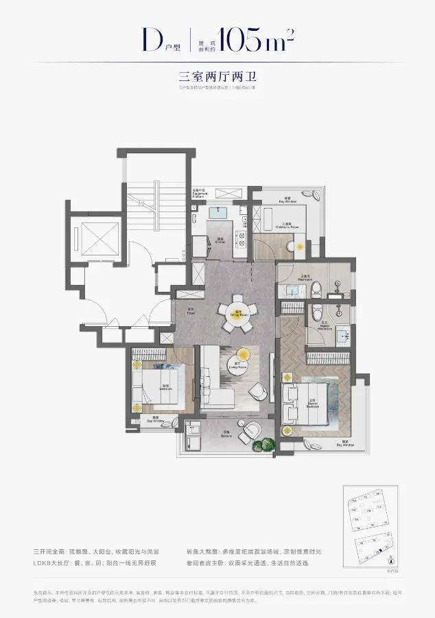 户型堪称革新典范,约103㎡的三房飞机户型,三开间朝南且搭配270°环景飘窗,得房率超80%,LDKB一体化厅堂设计,空间利用率远超同类产品。