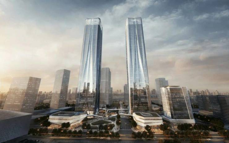 外立面是海派摩登风格,大面积玻璃幕墙搭配金属线条,独特的塔冠设计尽显地标风范,并且荣获2024年悉尼设计大奖室内金奖。