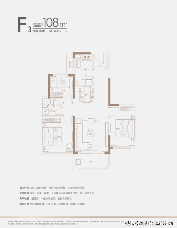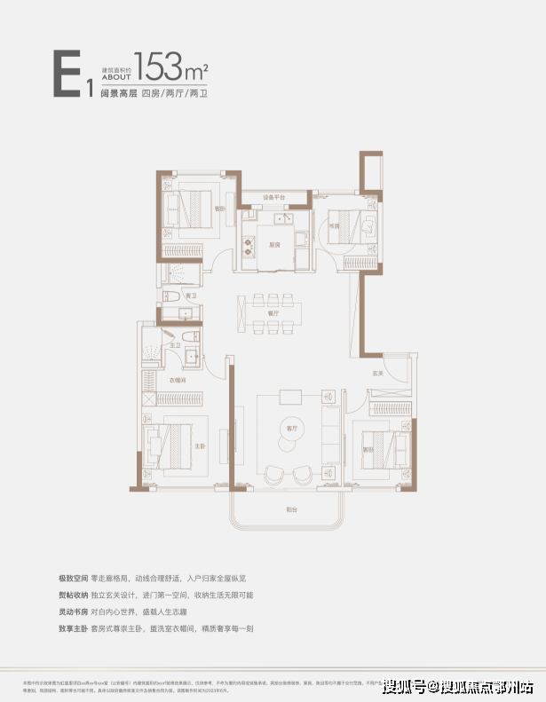 建面约140㎡四房:三开间朝南户型,南北通透,采光条件优质,客厅明亮宽敞,彰显大气布局。