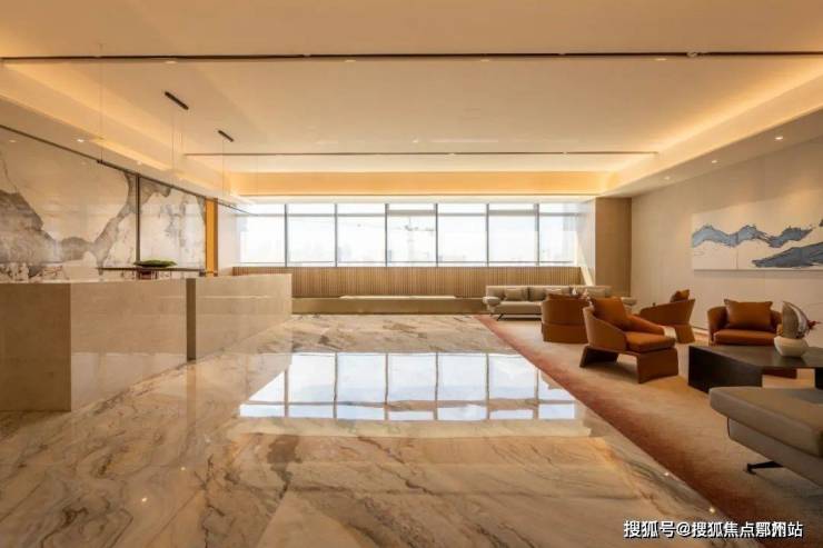 整个艺术大厅(目前的售楼处),光建面就达到了约1450㎡,设计的是通高玻璃幕墙配合约11米挑高,整体呈现的氛围感和星级酒店几乎没有差别,大气、有质感。