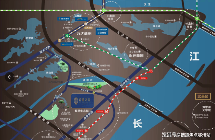 项目“四纵、三横、二高速”,有轨电车、16号线轨道交通、5G智能联网路线,迅疾交通,通达经开核心以及汉阳、武昌、汉口等区域。