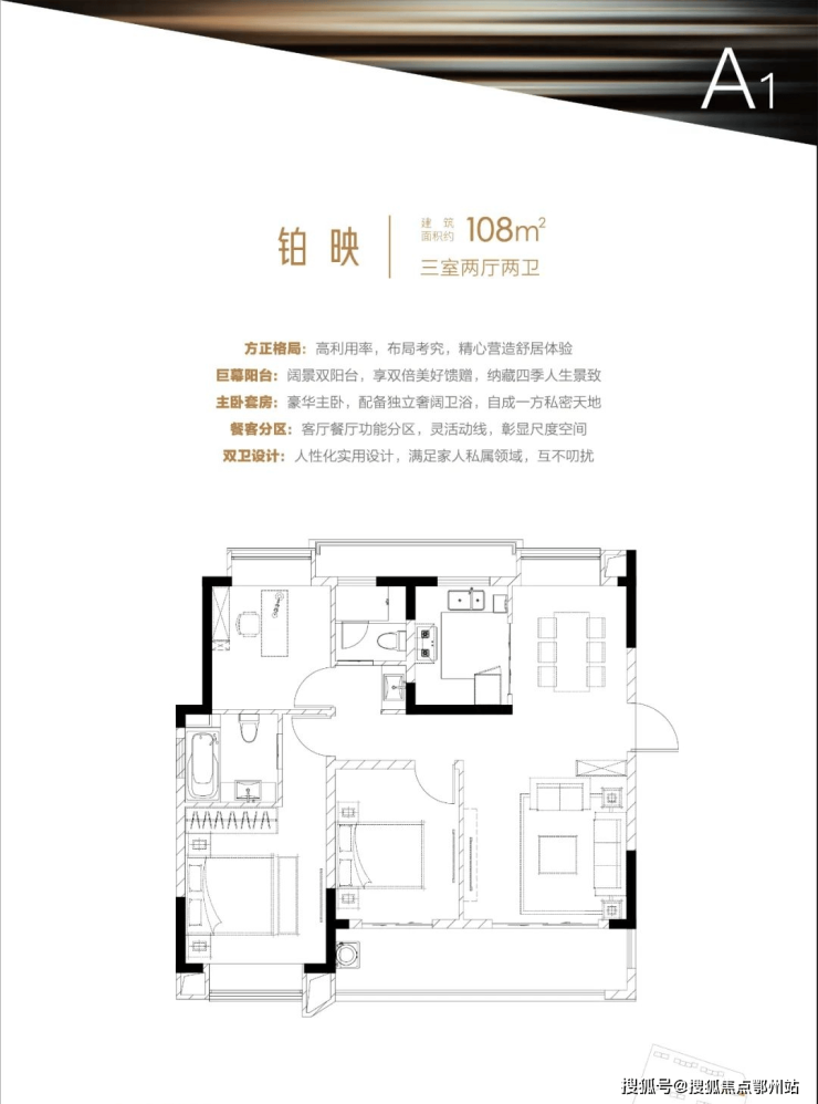户型点评:建筑面积108㎡三房,利用率高, 南北通透,格局方正,阔景双阳台配置,主卧配备独立卫浴。