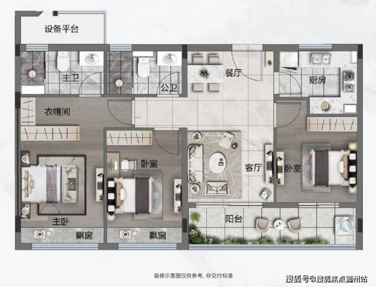 更让人惊艳的是卧室,三个朝南卧室都自带飘窗。其中东西两侧构成双主卧设计。