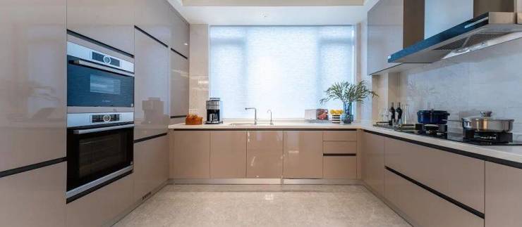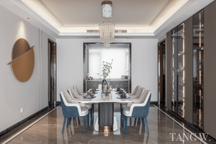 一层作为家庭起居空间,需要涵盖一个家庭生活的各个方面,设计师打通客餐厅及西厨区域,以简洁的线条,纯净的黑、白、灰三色,岩板背景、木饰面、金属、皮革,交替形成层次,无论是细部还是整体氛围的营造,都流露出极致与内敛。