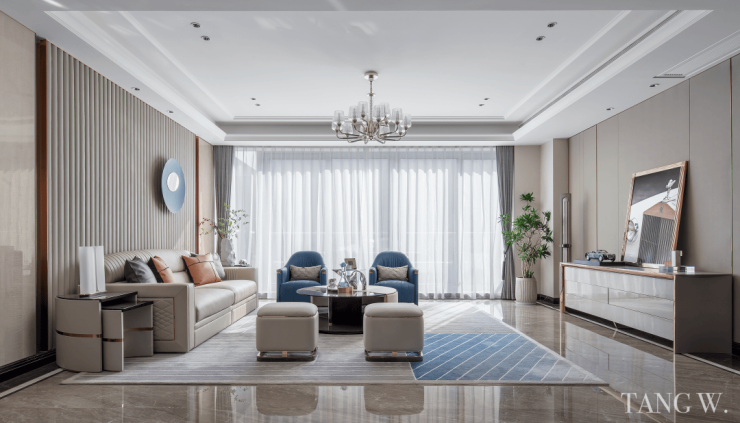 主卧重在表现安静的力量。相较于公共空间,主卧在延续黑白灰的基调之外,巧妙地加入了不同质感的蓝色,亚光面、皮革、木材以及布艺软装,温润的亲和感与自然气息在空间中糅合。