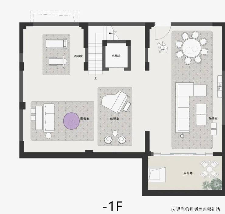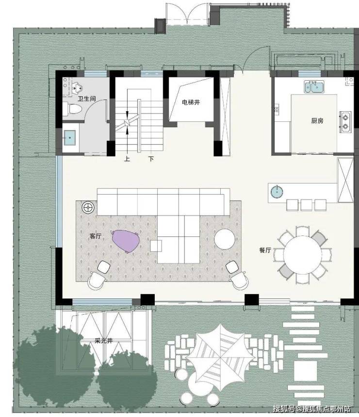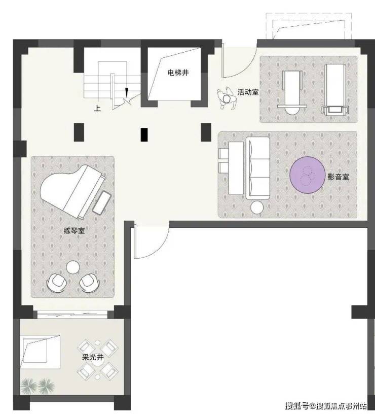 面积 约75㎡的地下室,不仅预留了 电梯井,还设计 南北双向采光井,把实用性和利用率做到极致。