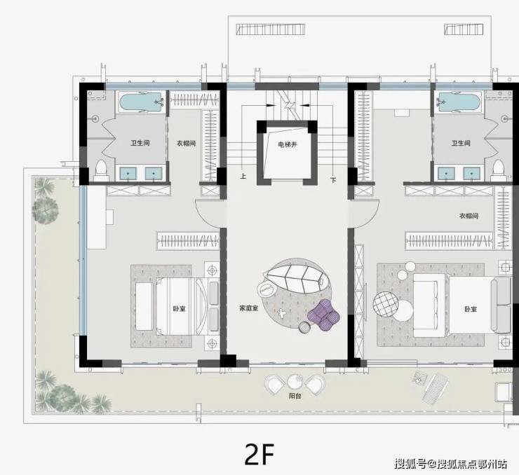 二楼以对称的形式放了 两个酒店式套房+一个家庭社交空间,完美诠释了大宅的奢侈感。