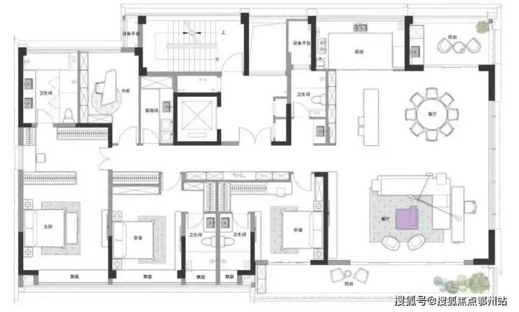 比如厨房可以做成中西双厨,餐厅外接独立阳台,玄关后设独立储藏室,阳台面宽约9.4米,进深约1.7米……