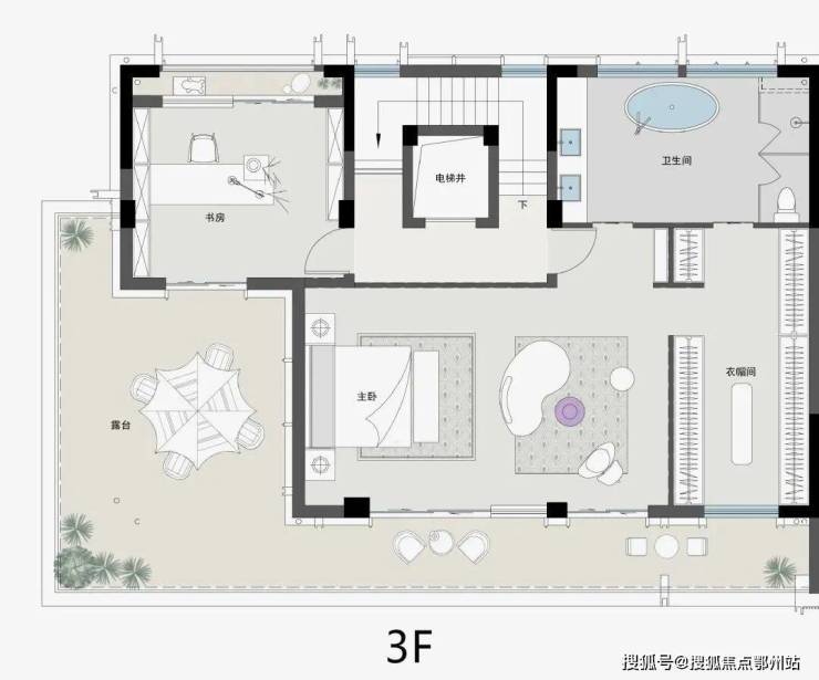 三楼是 标准的总统式套房,卫生间有大浴缸和双台盆,卧室放得下king size的大床,衣帽间是单独而设且带窗的,书房是朝南的,外面还自带星空露台。