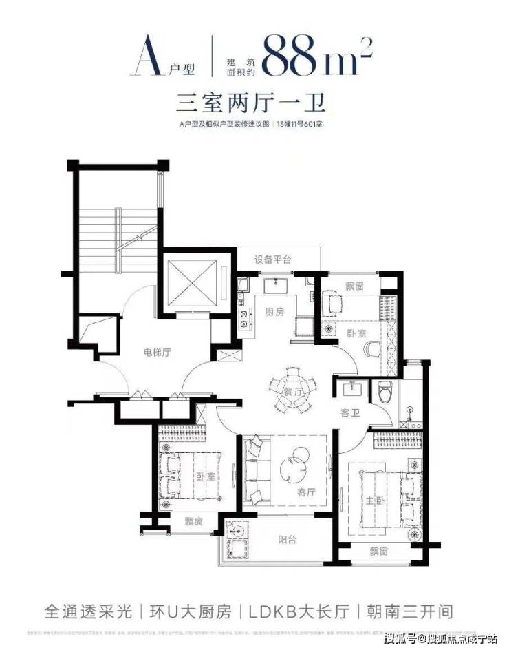 另外, 南北通透、三开间朝南、卫生间的干湿分离、全卧室带飘窗、U型厨房 ,这个户型拥有一个好户型拥有的全部优势。