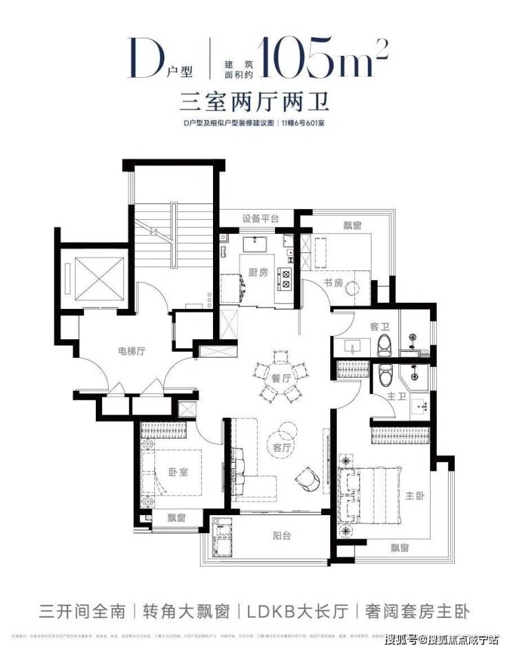 除此之外,边套的 建面约105㎡3房户型还打造了南北卧室双约270度转角飘窗 的设计,这个实际使用面积相当出众。