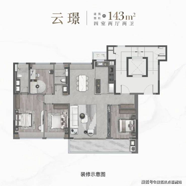 项目主推143-227㎡的大平层洋房,户型都是方厅,双联阳台,布局基本一致,只是在尺度上有所区别。