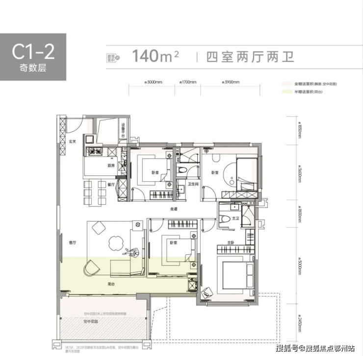 C2揽境在售建筑面积约107-140㎡三室、四室户型。
