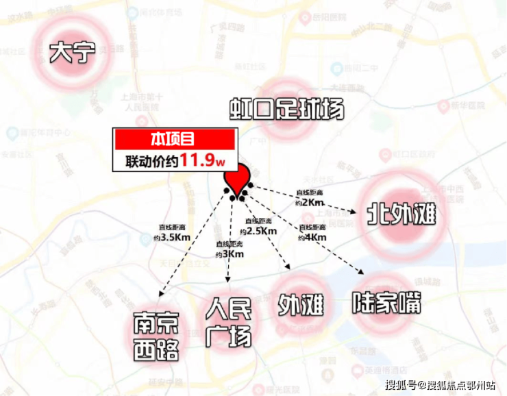 项目直线距离人民广场约3公里,直线距离外滩约2.5公里,直线距离南京西路约3.2公里,直线距离陆家嘴也仅约3公里,直线距离北外滩更是仅约2公里。同时背靠虹口龙之梦商圈和大宁商圈。