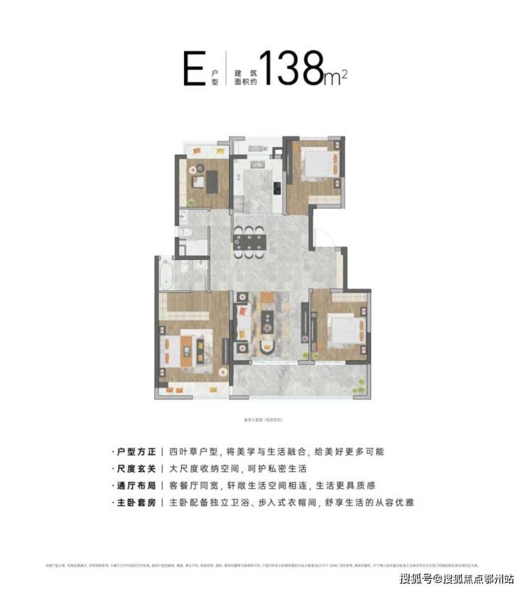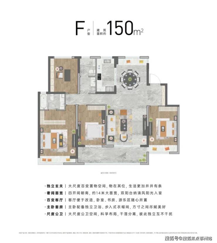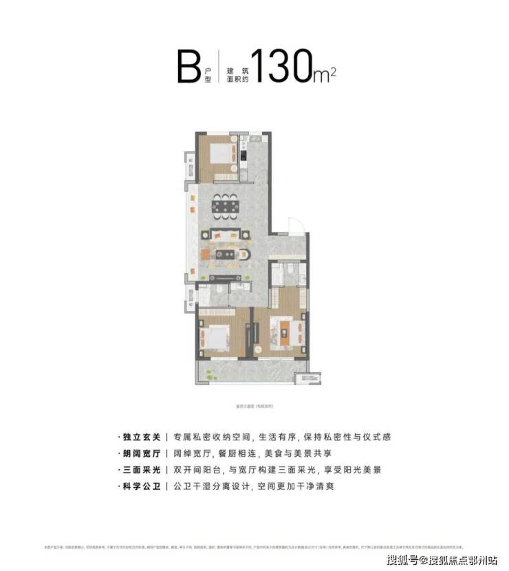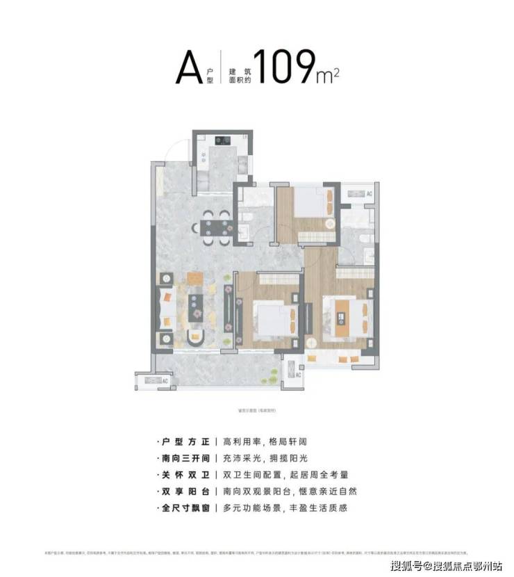 以建面约105㎡三房两厅两卫户型来看,起步即封神。