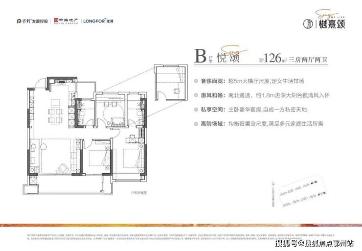 建面约126㎡三房两厅两卫户型,超气派餐客厅一体化设计, 约5米大横厅尺度联通阔景阳台 ,方寸之间设计感与尊崇感尽显。