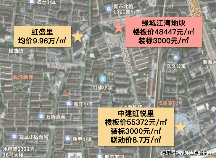 其中, 虹口江湾地块容积率2.25-2.5,溢价率6.48%,楼板价48447元/㎡,装修标准不低于3000元/㎡。