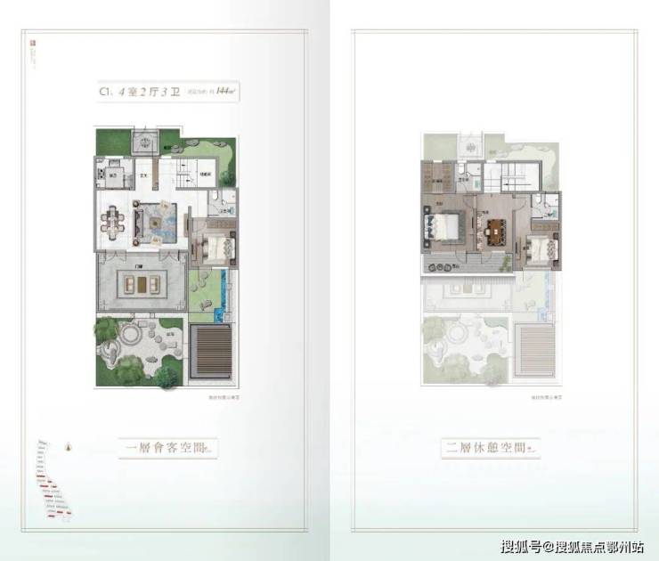 以建面约144㎡中式合院样板房为例,南向面宽约9.9米,餐客横厅开间约6.6米,尺度阔绰,餐客厅和一楼老人房都可以一步庭院。二楼为双套房、开放式书房,主卧套房带大露台,揽胜风景,观星赏月,视野开阔。