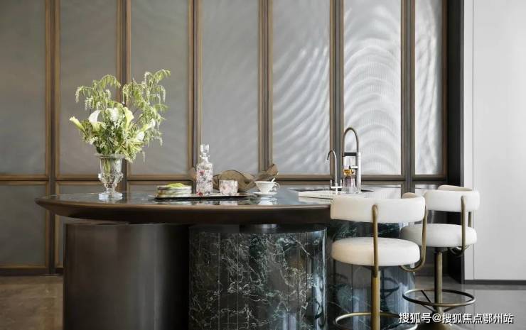 除了设计上的匠心灵感,也有源于大自然的古朴本真。为塑造更具美感的室内公区空间,CCD从众多石材中精心挑选芬迪白大理石,瑰丽柔和的纹路,点睛整片空间。由特色普拉达绿雕琢而成的独立岛台,经过二次切割再打磨,材料损耗度较高,其独特的圆弧造型,只为呈现尊贵品质与更多样体验的可能。