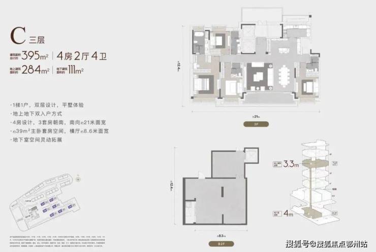 建筑面积合计约335-445m²,地上建筑面积约226-286m²,地下建筑面积约108-186m²,地上层高3.3m,地下层高4-6.65m,双入户方式,坐享买一层得两层的平墅生活。
