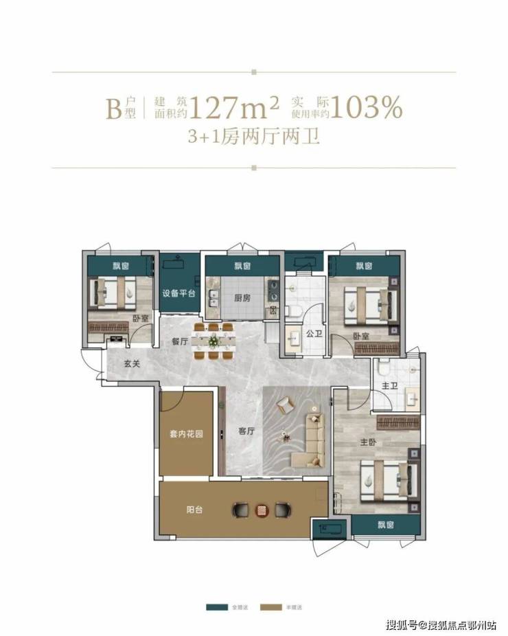 只计算一半面积的阳台、套内花园!不计面积的设备平台、飘窗,室内实得面积飙升,达到了约103%! 功能自由变化,进阶家庭多元需求。