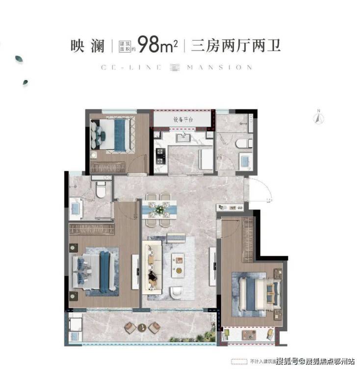 建面约98㎡映澜洋房户型,空间布局方正,南向三开间,约9.9m大面宽,大面积的玻璃设计,营造全明无死角的采光效果,餐客厅一体,