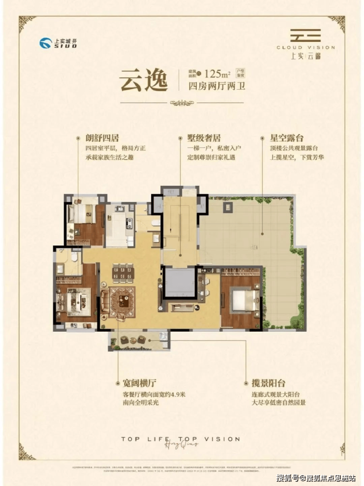 约125㎡四房两厅两卫,一梯一户设计,专属入户空间比肩墅居体验,是三代同堂优质户型之选。此户型做到了四开间朝南+主卧套房设计+卫生间干湿分离,超大南向采光面,室内通透明亮。