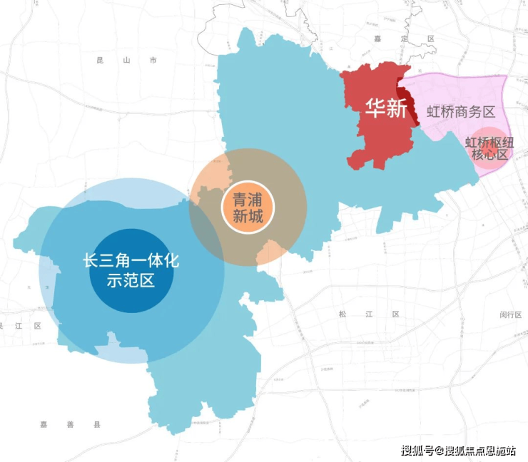 从地图上看,青浦区呈蝴蝶形状,华新镇就在蝴蝶东翼最靠近市区的位置上,处在青浦、闵行、嘉定三区交界处,作为西上海的门户,不论是对于推进大虹桥规划还是长三角一体化战略,均发挥着重要的影响。