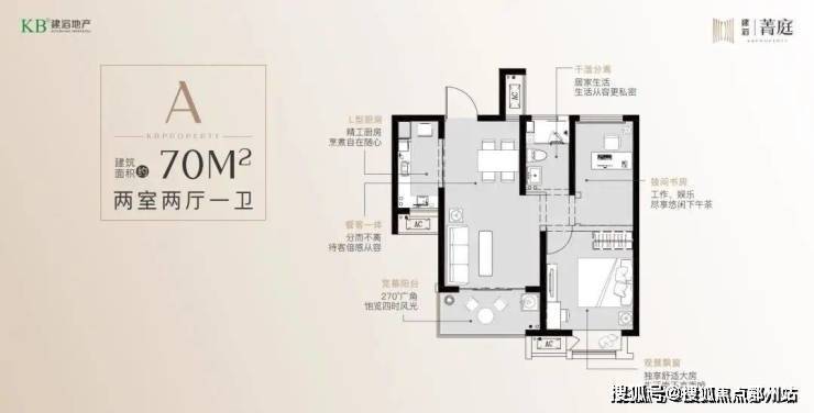 ① 建面约70㎡,两室两厅一卫。 刚需置业的爆款之选,空间利用十分高效,性价比高。 餐客厅一体化、南向观景飘窗卧室、270°观景阳台 ,都让空间显得更加开阔明亮; 干湿分离卫生间、L型厨房 ,区域功能划分明确。