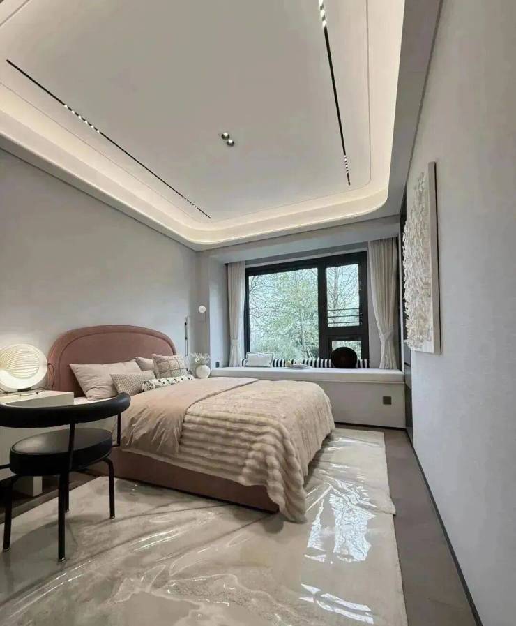 其中主卧的270°转角飘窗就有约5.7m²,通过与外立面的结合,直接做了梳妆台和储物柜,拓展了飘窗的实用性。