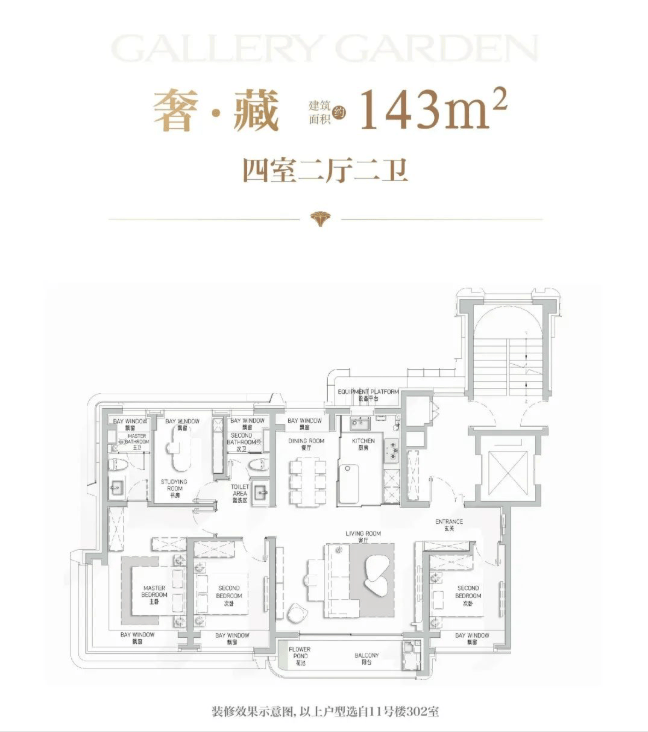143㎡洋房四房:南向四开间面宽约15.5米,主卧270°飘窗,“类一梯一户”设计