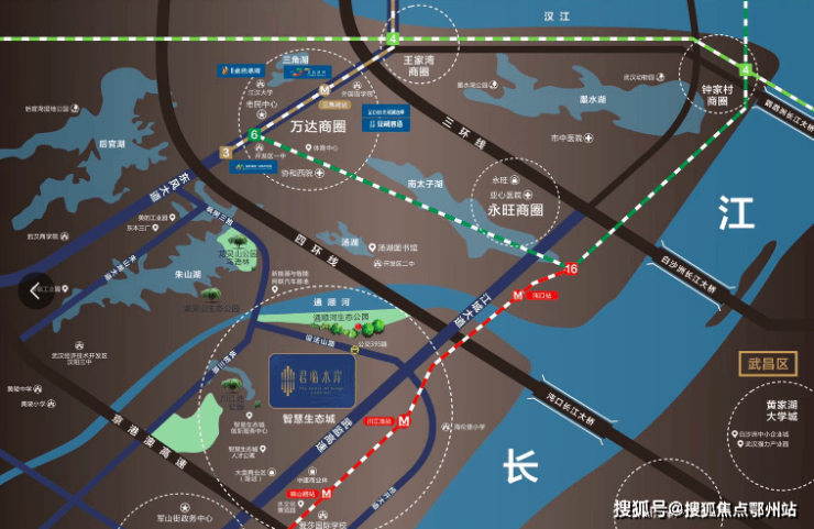 项目“四纵、三横、二高速”,有轨电车、16号线轨道交通、5G智能联网路线,迅疾交通,通达经开核心以及汉阳、武昌、汉口等区域。