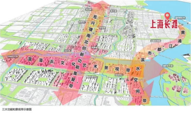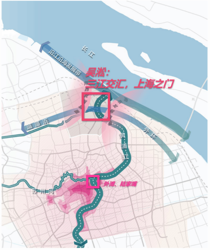 大吴淞地区整体的规划框架是要打造一个标志的“三江交汇”的上海之门,也就是三长江、黄浦江和蕰藻浜。这三江都是具有通航能力的河道,除了能够提供独特的景观价值之外,还能为产业提供很好的航运条件。
