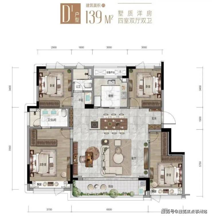 建面约139㎡的大四房,四开间朝南,主卧面宽约3.7米。包括北面书房在内,另外三个房间的面宽都达到约3米,不会觉得局促。