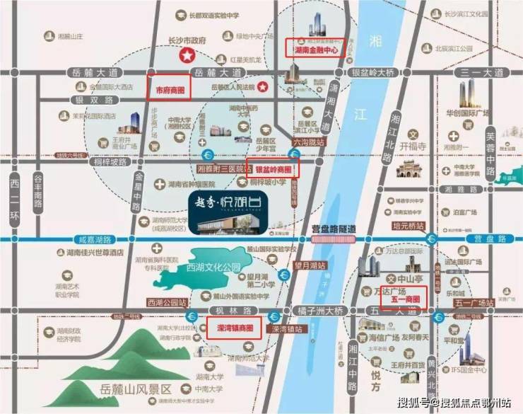 项目靠近 市府商圈、银盆岭商圈、溁湾镇商圈 等3大商圈, 河西王府井、金星路步步高、奥克斯广场 等3大商业综合体环伺;