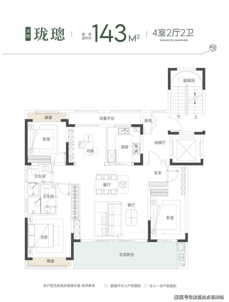 洋房:建筑面积约143㎡ | 4室2厅2卫 ,一梯两户/南北通透/双开间阳台/豪华主卧套