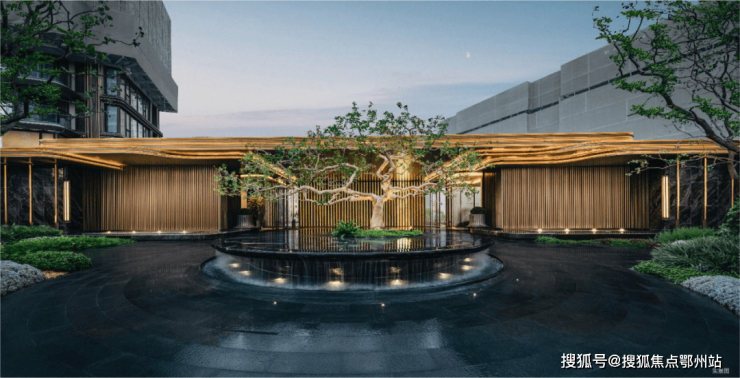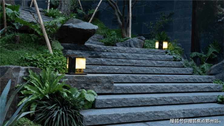 而实景首开的近2000㎡下沉庭院,作为“园林灵魂”,漫步此间,你会看见:乌金原石围合的“玉扣绿岛”上,低调静放着团队自“天下玉源”河南南阳历时遴选而来,近7000年的“国玉”独山璞玉,与山野林木共此氤氲灵气,尽显东方温润;从诗经走出来的近11m高参天乌桕,则再现古诗中所描述的“秋林城郭画图中,乌桕千株照眼红“的诗意;采用约6.7m幻影蓝奢石打造的“叠级水瀑”跌水台,池底以呈现天然墨绿色泽的蓝金刚石铺就,映水之澄明,境之悠远;连台阶都采用了“黑色花岗岩之王”安哥拉黑整石,沿云梯而上,让人返璞内心东方......