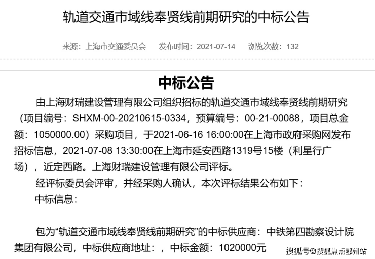 (奉贤线前期研究中标公告-图源网络)