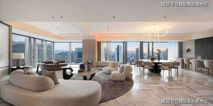 渡边智昭的约520m²设计作品,设计主题是「艺术桃花源」:一开门,映入你眼帘的是纯手工打磨的哑光亚克力玻璃,地面通铺的是「直纹白金沙」的平行四边形拼花,窗外是杭州大厦与连绵的西湖群山。 沙发背后一道可开可合的弧形移门,创造出一个别样温馨的小尺度空间。岛台、餐厅、客厅和壁炉咖啡厅……功能足够多,才能形成空间的流动性。
