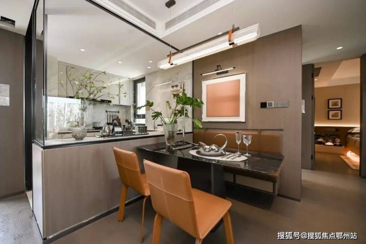 通过玻璃窗将餐客厅和厨房连接起来,从视野上看,餐客厅成了厨房的延伸,LDKB一体化感更强。而且玻璃窗的设计,也是交付标准,住进来后,既不会影响一家人的互动,又能有效阻隔油烟。
