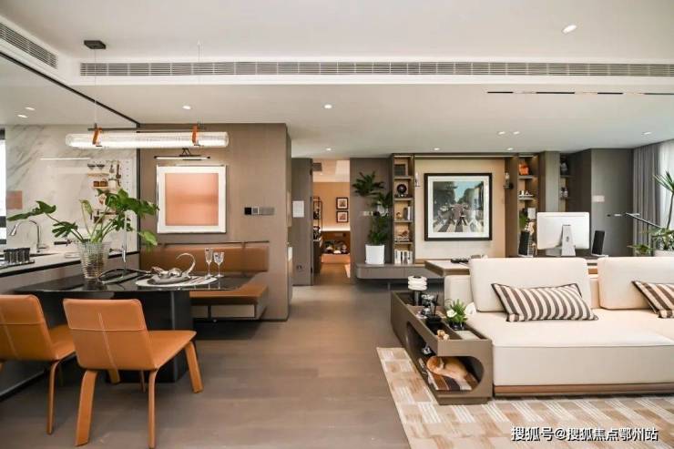 这是一个经典的三房设计,南向三开间,面宽约9.3米,双联大阳台和全景飘窗,将视野和空间感进一步放大, 从样板间呈现来看,完全达到了普通楼盘建筑面积约110㎡户型的空间感。